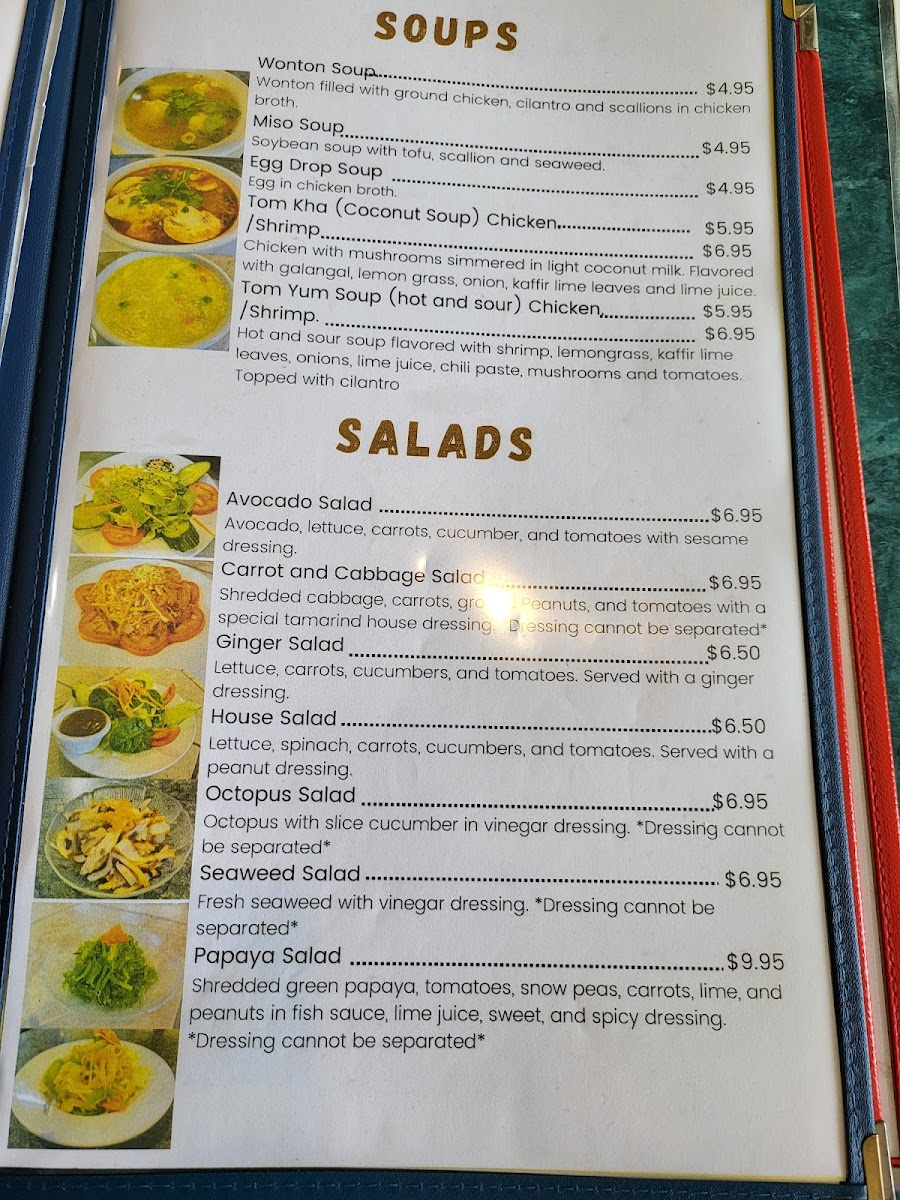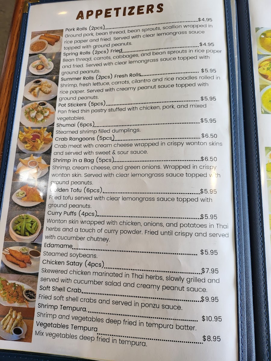 Expect approachable plates like Pad Thai, Yellow Curry, and Tom Yum Soup that work well both as satisfying solo meals and shareable options when dining with friends or family. The menu also includes a range of appetizers, such as Spring Rolls and Crab Rangoon, making it the kind of place where you can leisurely nibble and enjoy light conversations over familiar favorites.